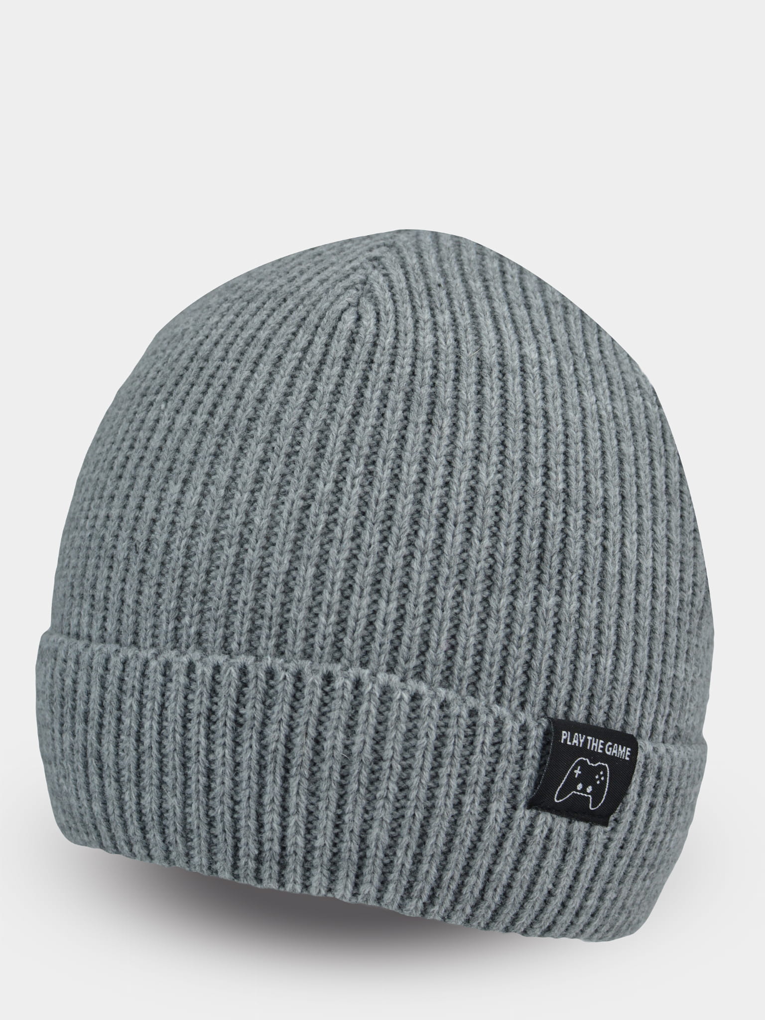 CZ075-B-01 Czapka zimowa chłopięca pojedyncza wywijana naszywka szara